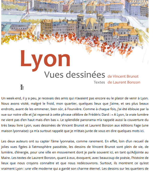 Article « Lyon en dessins et en talents » publié le 12 février 2012 sur le site de Najat Vallaud-Belkacem, alors adjointe à la Mairie de Lyon, saluant le travail de Vincent Brunot.