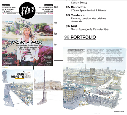 Article « Coup de crayon sur la ville » dans le magazine Vivre Paris numéro 19, le 15 juin 2014, consacré au livre Paris Vues Dessinées de Vincent Brunot.